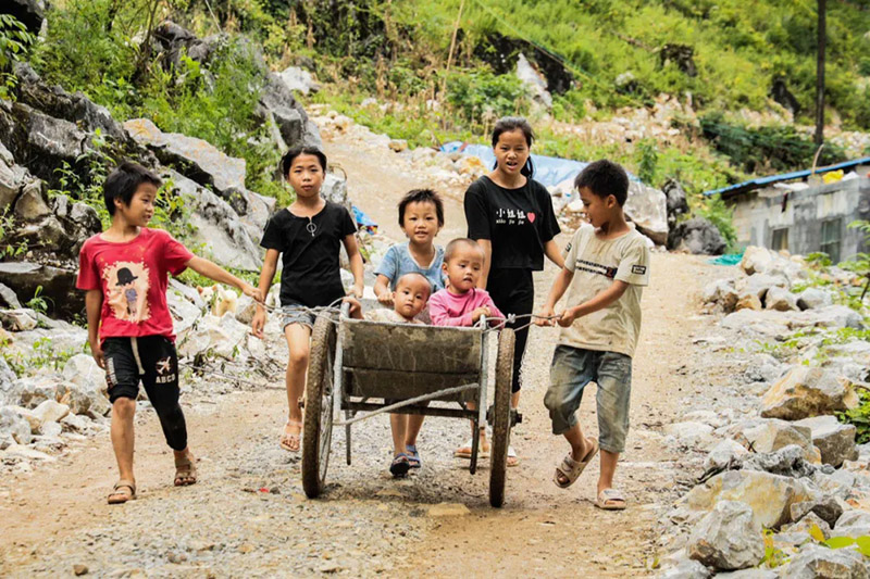 大人們忙著干活兒的時候,稍小的孩子在家門口打鬧,互丟泥團、揮著樹枝追趕。