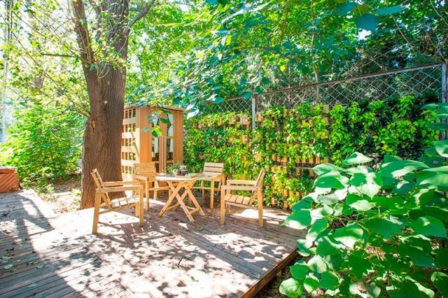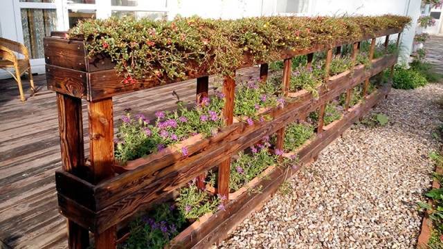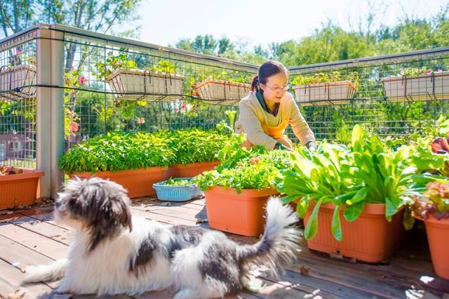 ▼再在前院的木地板上,組裝起來一個花欄,上面種滿了蒼翠欲滴的蔬菜草木,上面的花草可以欣賞,下面的蔬菜,可以采摘,簡直將生活過成了詩。