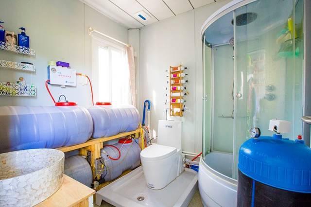 ▼高科技感的衛生間設計,而衛生間設計,也是科技感滿滿,日常糞便,通過管道進入大桶,并且會發酵成沼氣,消毒后通過氣壓,直接成為農肥,可以直接滴灌到屋頂的菜園花園里!