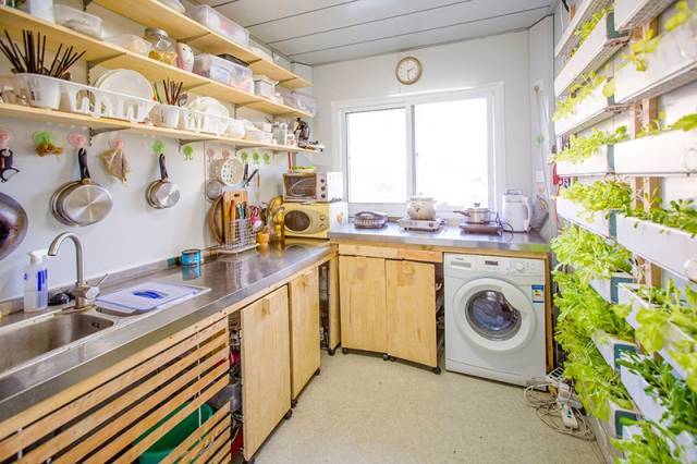 而廚房的墻面之上,牛大叔設計了一個立體的墻面菜園。墻面上,提供了太陽能發電LED植物生長燈,在廚房的墻壁上,就可以直接種菜,這個想法,簡直太天馬行空了!