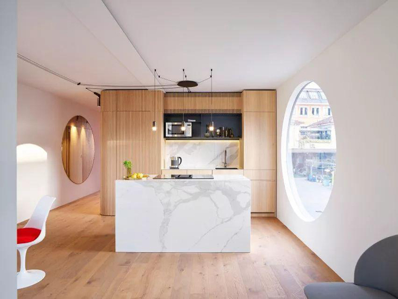 整個集裝箱別墅正面沒有過多的運用全落地玻璃,只是開了一個原型的玻璃。想要看到里面究竟有什么就去里面一探究竟吧。