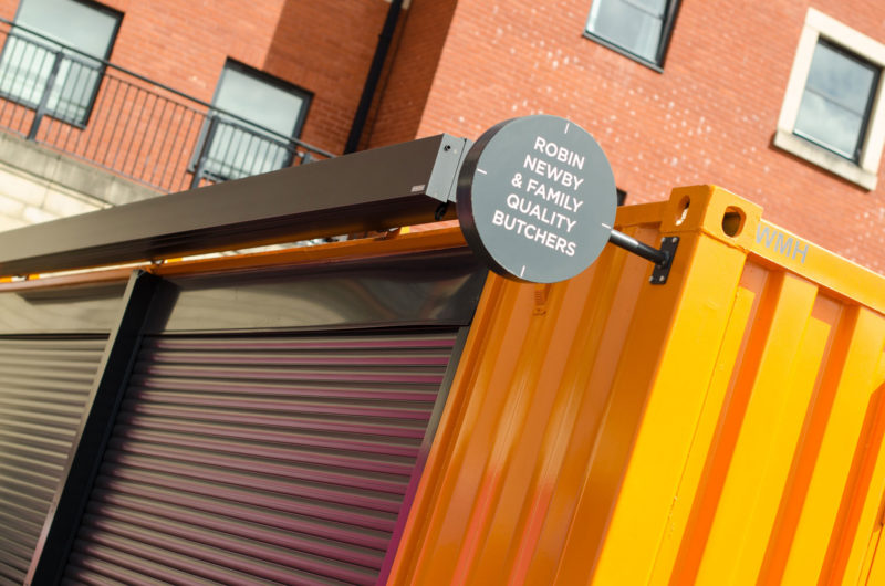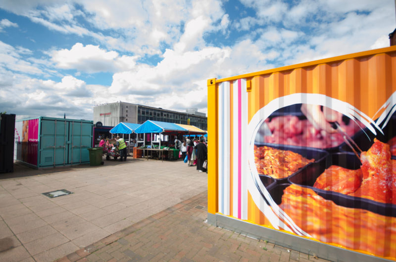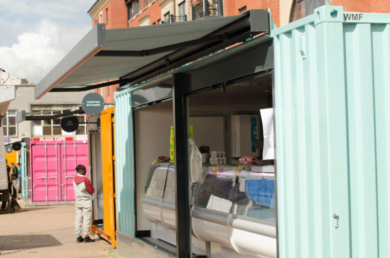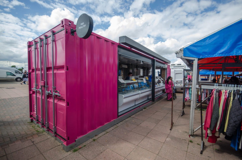 這是位于英國伍爾弗漢普頓市場,經過重新開發和轉移成為城市中心歷史建筑重建的重要部分。為了使市場迅速重新運行,集裝箱是這次重建的主角。同時,集裝箱的模塊結構可以獨立分隔各店鋪,管轄各自店內的衛生環境,保證整個市場的清潔。