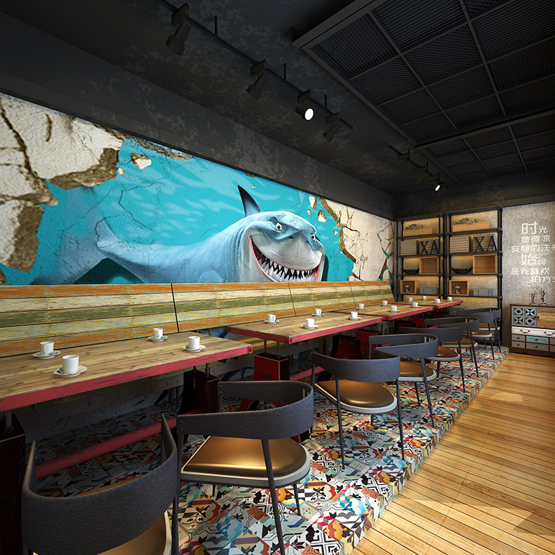該烤魚館的裝飾采用“北歐風格”,淺色的木質桌子與木質地板跟周圍墻體圖案相互映襯,具有簡約、自然、人性化的特點,在此吃魚,定能吃出不一樣的感覺!