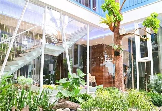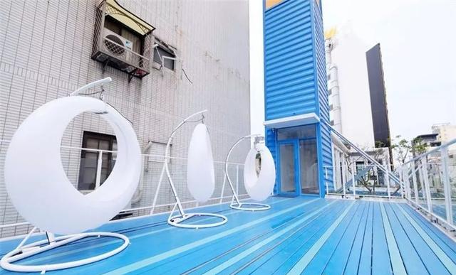 看到如此熟悉的紋路,就應該知道這又是一家集裝箱改造而成的三層建筑了。然而事實是建筑的外表僅以集裝箱鐵皮作為裝飾,實則為鋼骨結構。外觀以藍白為主,形似一艘大船停泊在黎明路上。