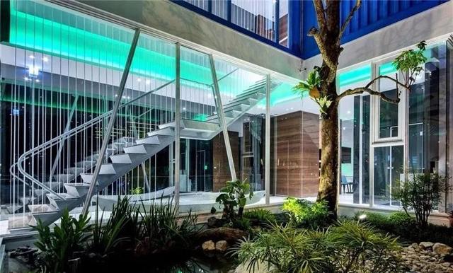 三層樓的設計皆不相同,一樓以密集板加上2D激光,打造出海浪輕涌的造型。門前利用與人行道相接的一小塊空地規劃生態池、種植茄苳。路人經常被外觀所吸引。