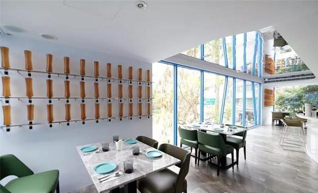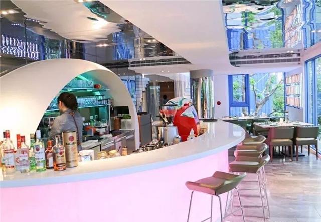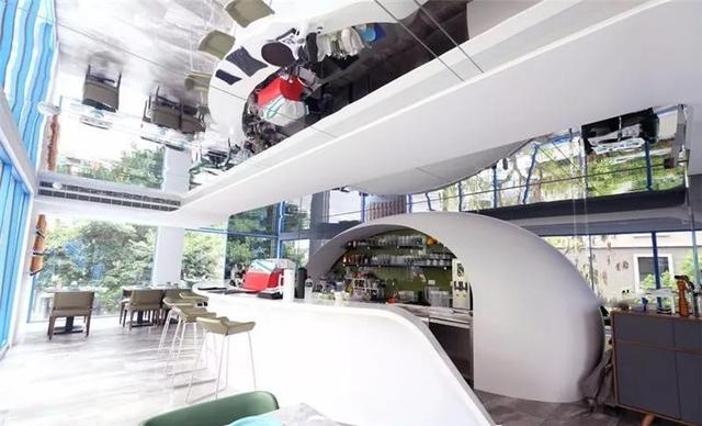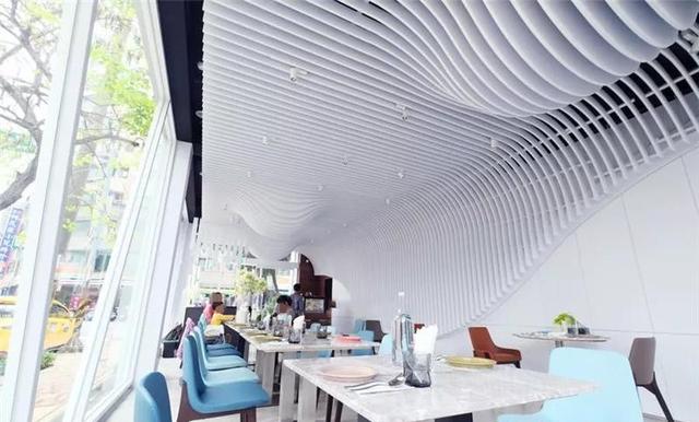 一樓主要為落地玻璃的透光設計,靠墻一邊的天花是片狀材料拼成的水滴型裝飾,極具現代感和藝術線條美,讓環境瞬間變得高大上起來,引起視覺上的愉悅,有利于顧客用餐心情。