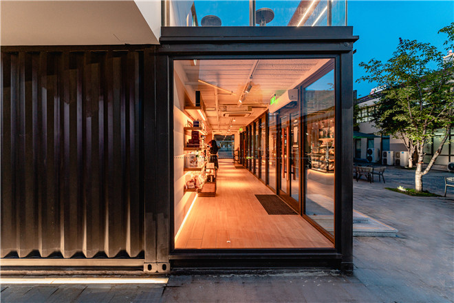 概念店由6個(gè)大小不同、白棕相間的集裝箱穿插交疊而成,共有兩層。一層是交錯(cuò)開來的點(diǎn)單區(qū)和用餐區(qū),并設(shè)置了大片通透的玻璃幕墻,從外界看可以將箱體內(nèi)的整體面貌盡收眼底。